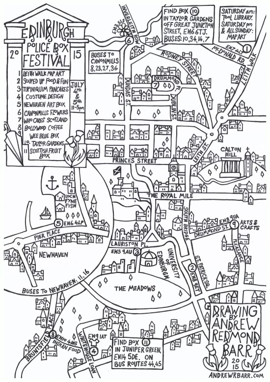I was delighted to be asked to design the festival map, and to be given a space in the Leith Walk police box to exhibit some of my work over the weekend. Thanks to Simon Baker for taking photographs.